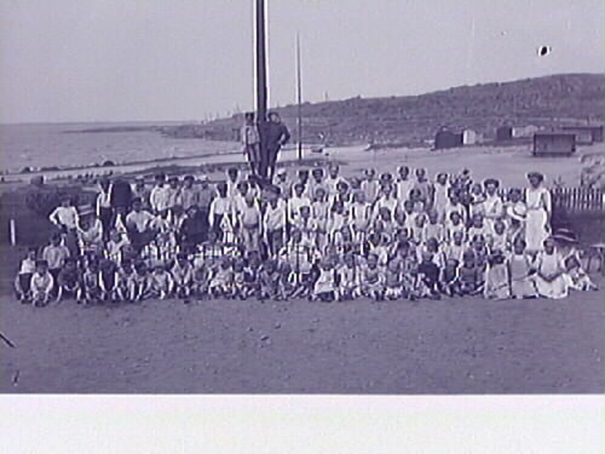 Patienter och personal på stranden vid Lilla Apelviken, Kustsanatoriet. Några av barnpatienterna sitter i sina sängar och två gossar står ovanför gruppen och klamrar sig vid en stolpe. I bakgrunden syns några bodar/badhytter. (Se KSA15 för högre upplösning)