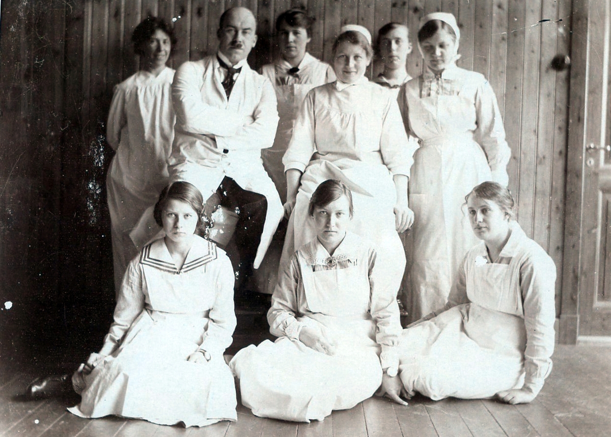 Sjukvårdspersonal på Kustsanatoriet Apelviken i träpaviljongen från 1904.
