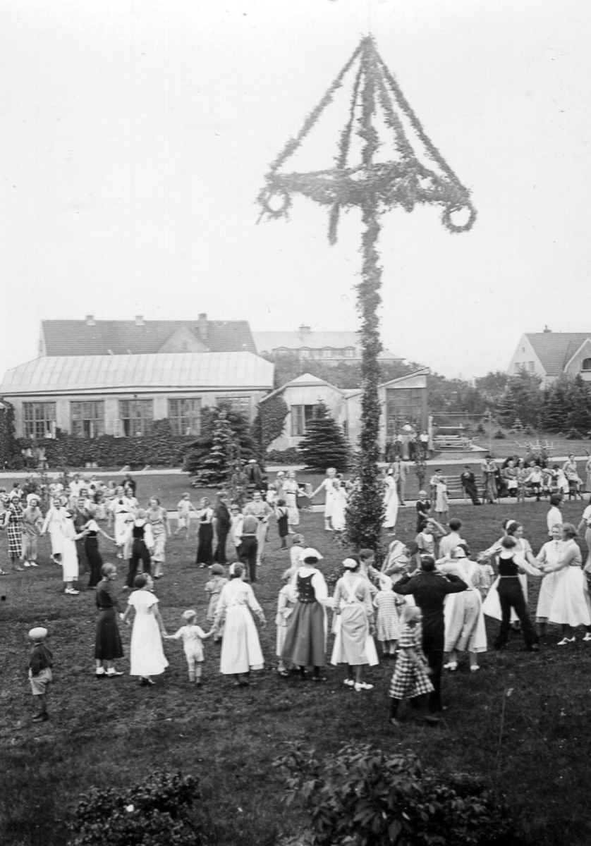 Midsommardans kring stången på Kustsanatoriet Apelviken med patienter och personal.