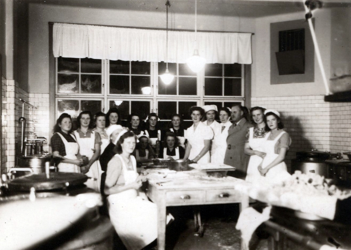 Sysslomannen Carl Ahlin (till höger) tillsammans med kökspersonalen på Kustsanatoriet Apelviken i köket.