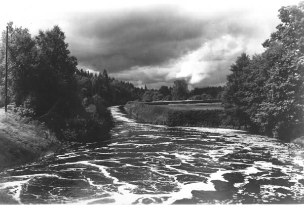 Ån Nissan slingrar sig kantad av lövträd och barrskog på höjderna under mörka moln.