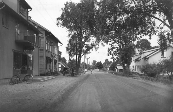 Nissastigen genom Rydöbruk med bostadshus och affärer, bland annat Bengtssons livs till vänster med parkerade cyklar utanför.