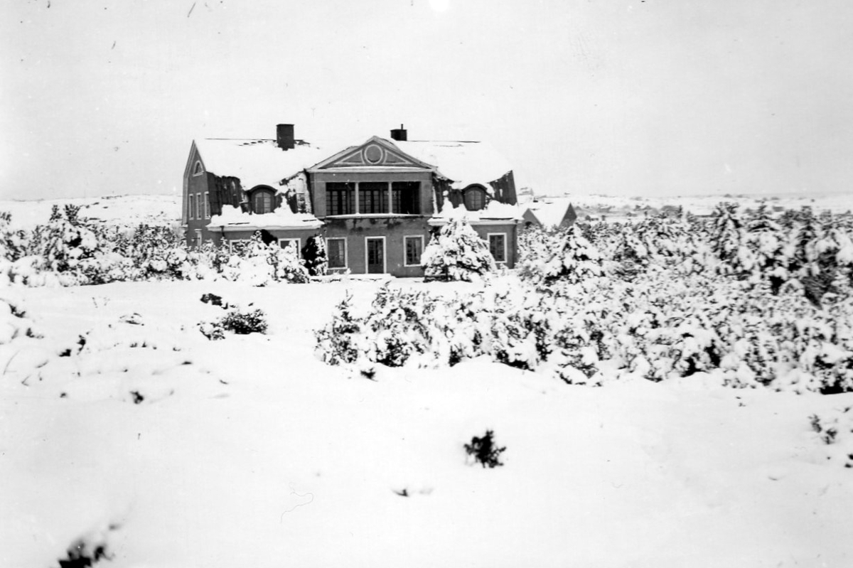 Överläkarvillan vid Kustsanatoriet Apelviken i vinterskrud, södra fasaden med entré och indragen balkong däröver. Huset kallades "Maison d'Hanson" eller "Hansonska huset" eftersom dr Robert Hanson blev den förste att flytta in i villan, som stod klar 1929 och ritades av sanatoriets arkitekt Gustaf Birch-Lindgren.