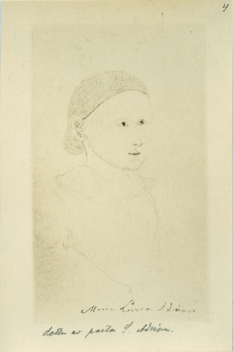 Tecknat porträtt av Maria Lovisa Adrian dotter till Hovpredikant Sam Adrian omkring år 1850.
