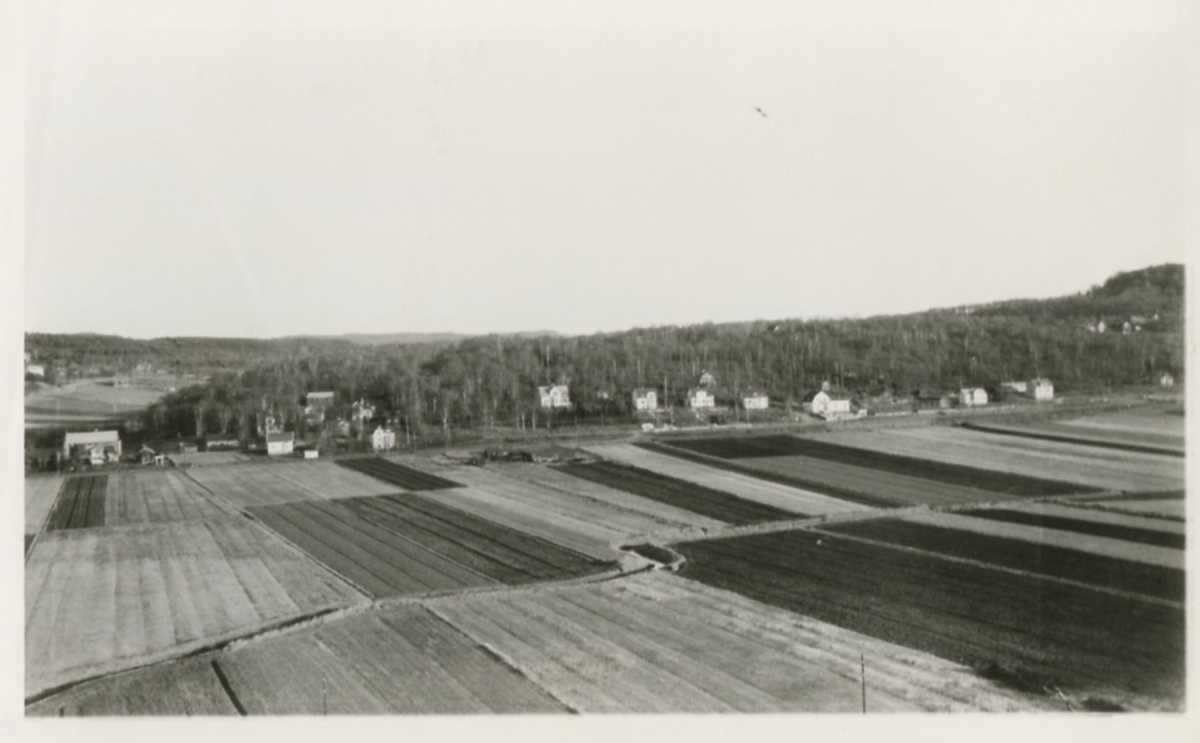 Vy från Ramnåsen* över "Kärret" (mellan Bölet och Vommedal) söder om Kållereds station och Kyrkbacken 1940-tal Till höger anas Sagåsen.