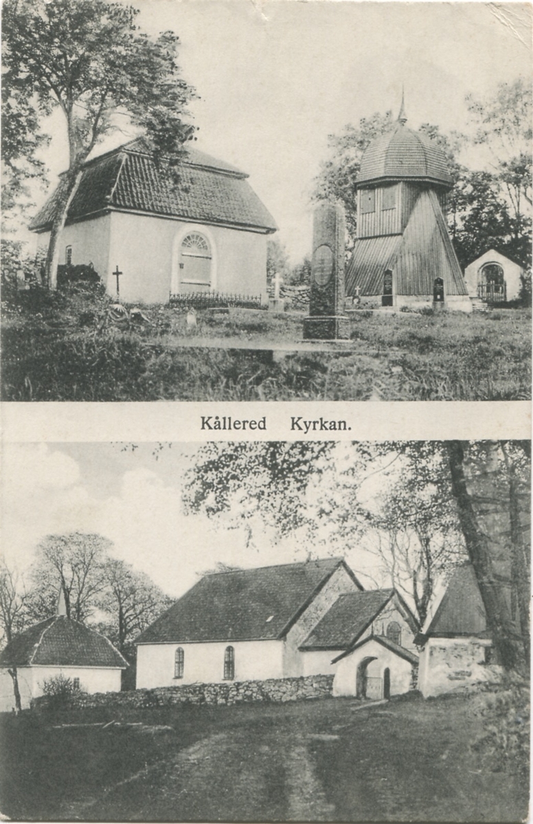 Dubbelvykort "Kållered. Kyrkan" på Kållereds kyrka, Almrothska koret och klockstapeln skickat till Göteborg år 1919, troligtvis av sommargästen Tage Kinnmark i Kyrkbacken.