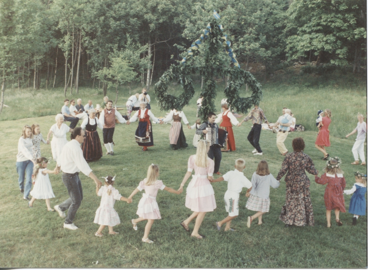 Dans kring midsommarstången vid Långåker 1:3 Hembygdsgården 1993. Okänd dragspelare i mitten.