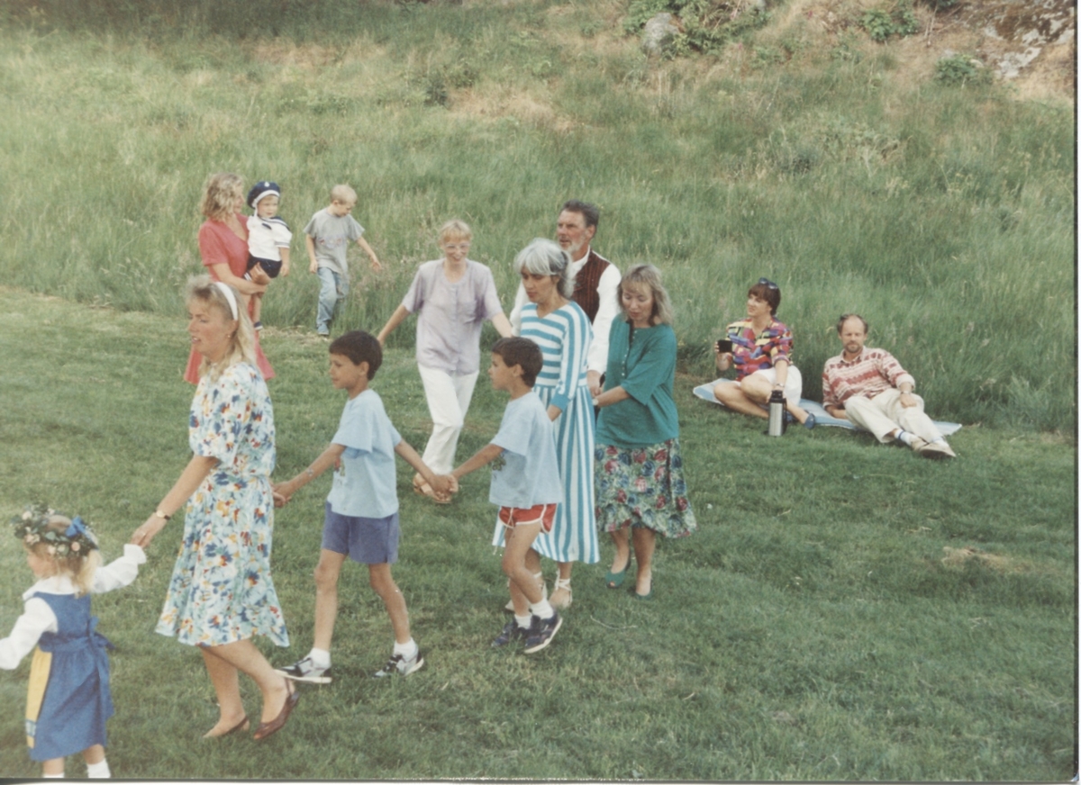 Dans kring midsommarstången vid Hembygdsgården Långåker 1:3 1993. I mitten skymtas Berny Gustafsson klädd i folkdräkt, Övriga namnuppgifter saknas.