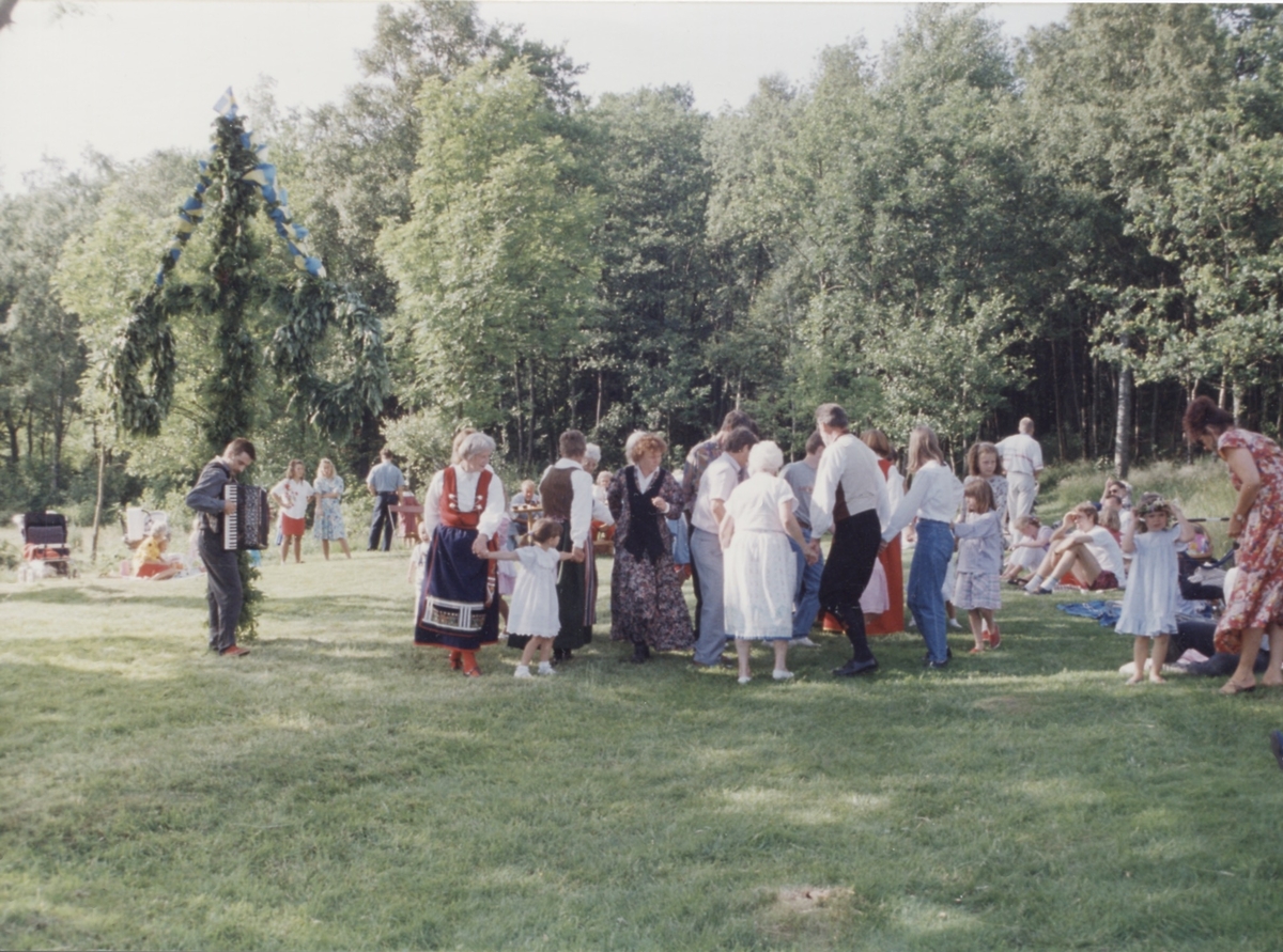 Dans kring midsommarstången vid Långåker 1:3 Hembygdsgården 1993. Till vänster i Värendsdräkt ses Marianne Jansson (1924-2006). Den manlige okände dragspelaren är från Göteborg.