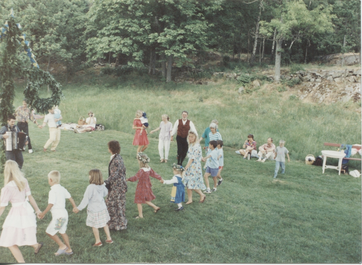 Dans kring midsommarstången vid Hembygdsgården Långåker 1:3 1993. I mitten skymtas Berny Gustafsson klädd i folkdräkt, Övriga namnuppgifter saknas.