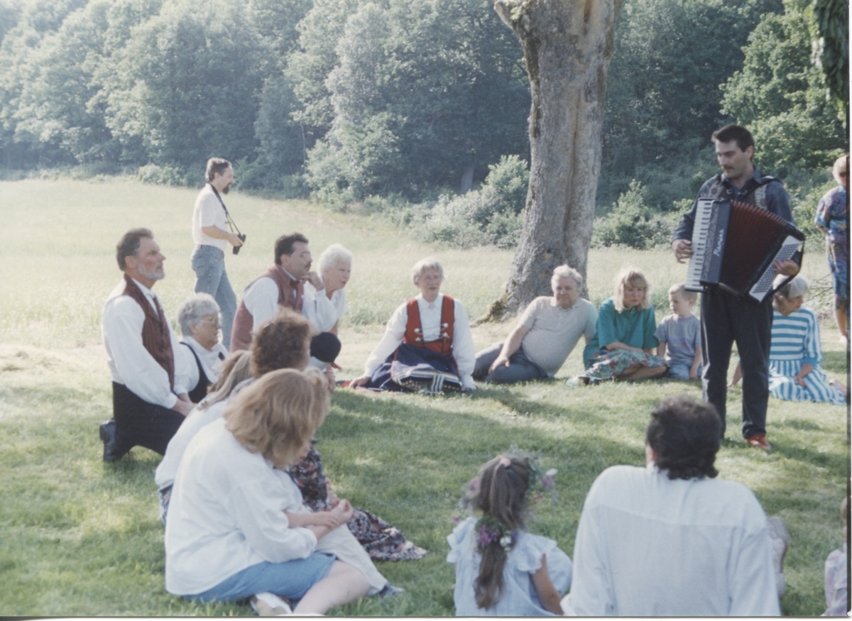 Dans kring midsommarstången vid Hembygdsgården Långåker 1:3 1993. Sittande från vänster: 1. folkdräktsklädde Berny Gustafsson. 2. Eivor Bjerrhede (1921-2015). 3. Staffan Bjerrhede. 4. Aina Olsson (1917-2007) och 5. Marianne Jansson (1924-2006). Till höger står en okänd dragspelare från Göteborg.