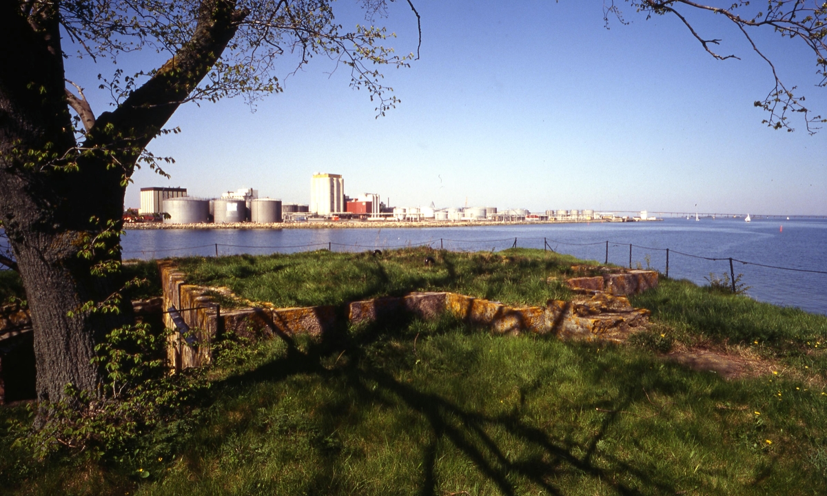 Titel: Grimskär. På 1560-talet anlades på Grimskär en skans, vilken i 1611 års krig under överste Lars Bubbs befäl verksamt hindrade danska flottans rörelser. Skansen byggdes om 1622-23 och förstärktes ytterligare år 1688 samt ingick sedermera som en viktig del i de storartade förslag till Kalmars befästande, som uppgjordes under senare hälften av 1700-talet. På holmen byggdes 1837 en fyr. Fyren byggdes om och förbättrades 1865 och 1879 till en kombinerad fyr och lotsutkik. 1931 lades lotsverksamheten ner och 1940 ersattes fyren av en ny fyr i Kalmarsund. Ett år senare revs det gamla fyrtornet. 1943 anlades en underjordisk minstation under skansen. Stationen hade 11 mans besättning som samsades på 50 m². Minorna var utlagda i Kalmarsund och färjan mellan Kalmar och Färjestaden passerade dagligen, besättningen ovetandes om denna minering, tills den sista färjan avgick den 30 september 1972, samma dag som Ölandsbron invigdes. Bernt Ohlson var chef för minstationen mellan 1965 och 1985. Minstationen avvecklades 1988. (Uppgifterna är hämtade från Wikipedia).