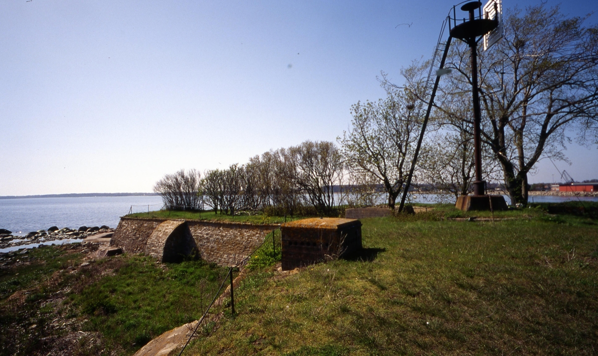 Titel: Grimskär. På 1560-talet anlades på Grimskär en skans, vilken i 1611 års krig under överste Lars Bubbs befäl verksamt hindrade danska flottans rörelser. Skansen byggdes om 1622-23 och förstärktes ytterligare år 1688 samt ingick sedermera som en viktig del i de storartade förslag till Kalmars befästande, som uppgjordes under senare hälften av 1700-talet. På holmen byggdes 1837 en fyr. Fyren byggdes om och förbättrades 1865 och 1879 till en kombinerad fyr och lotsutkik. 1931 lades lotsverksamheten ner och 1940 ersattes fyren av en ny fyr i Kalmarsund. Ett år senare revs det gamla fyrtornet. 1943 anlades en underjordisk minstation under skansen. Stationen hade 11 mans besättning som samsades på 50 m². Minorna var utlagda i Kalmarsund och färjan mellan Kalmar och Färjestaden passerade dagligen, besättningen ovetandes om denna minering, tills den sista färjan avgick den 30 september 1972, samma dag som Ölandsbron invigdes. Bernt Ohlson var chef för minstationen mellan 1965 och 1985. Minstationen avvecklades 1988. (Uppgifterna är hämtade från Wikipedia).