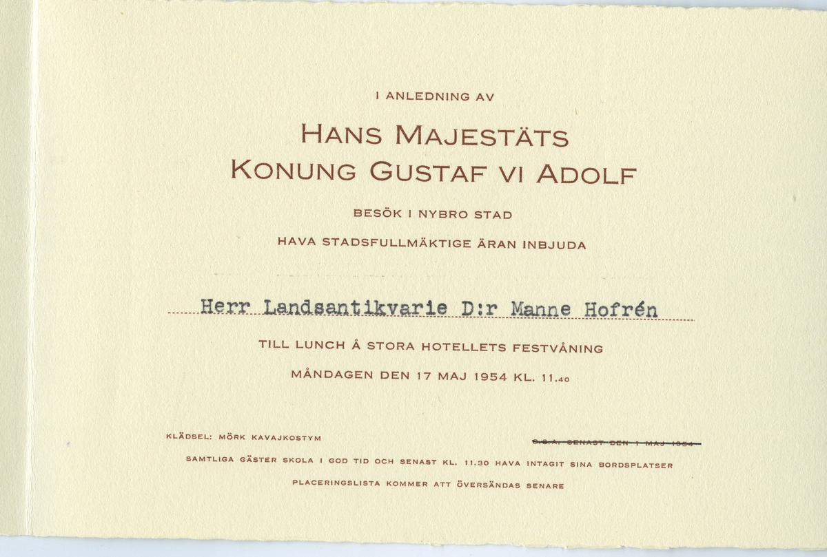 Inbjudan till landsantikvarie Manne Hofrén att närvara vid kungamiddag i Nybro. Gustav VI Adolfs Eriksgata.