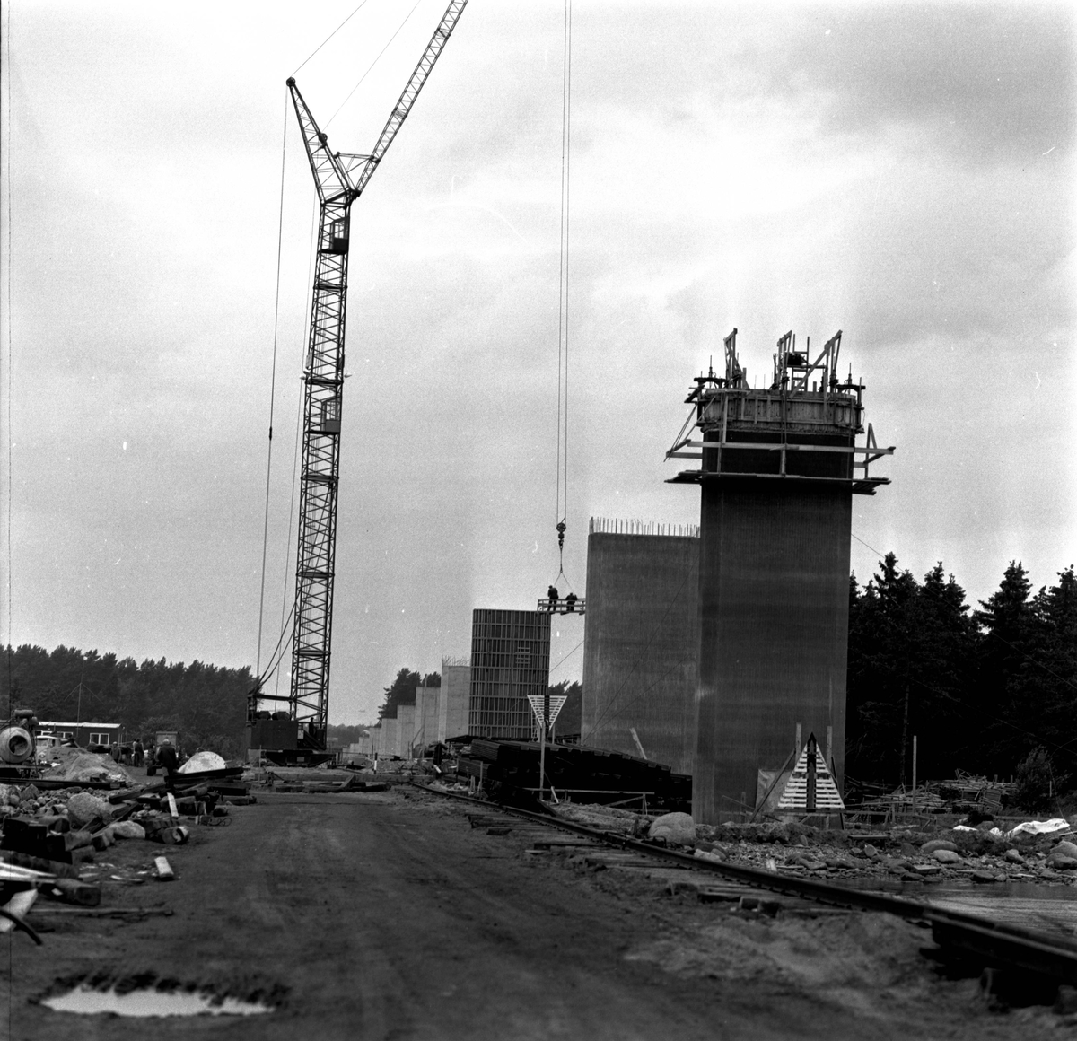 Här ser man hur Ölandsbron växer fram. Den började byggas 1968 och stod färdig hösten 1972. Bron byggdes från två håll och det var stora festligheter när man möttes mitt i Kalmarsund.