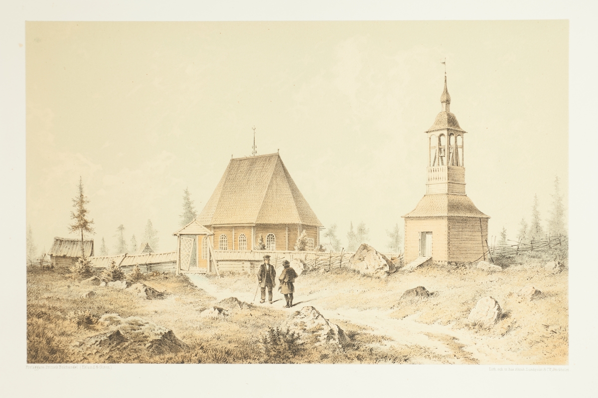 Färgtryck. Vy över fjällandskap med kapell, Två män på vägen. Motivet "Jokkmokks kapell" är hämtat ur Carl Anton Petterssons planschverk Lappland, dess natur och folk från 1866.