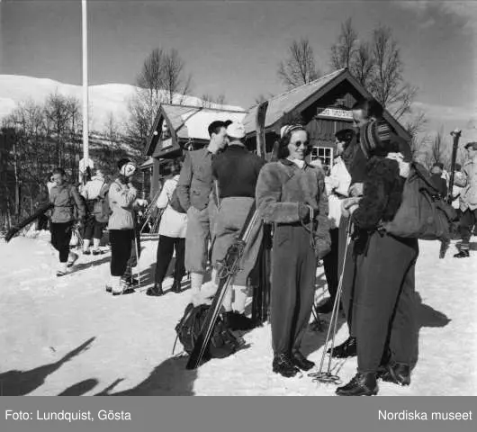 Turister utanför fjällstation, Abisko turiststation. Vinter och snö, soligt väder. Skidor och packning.