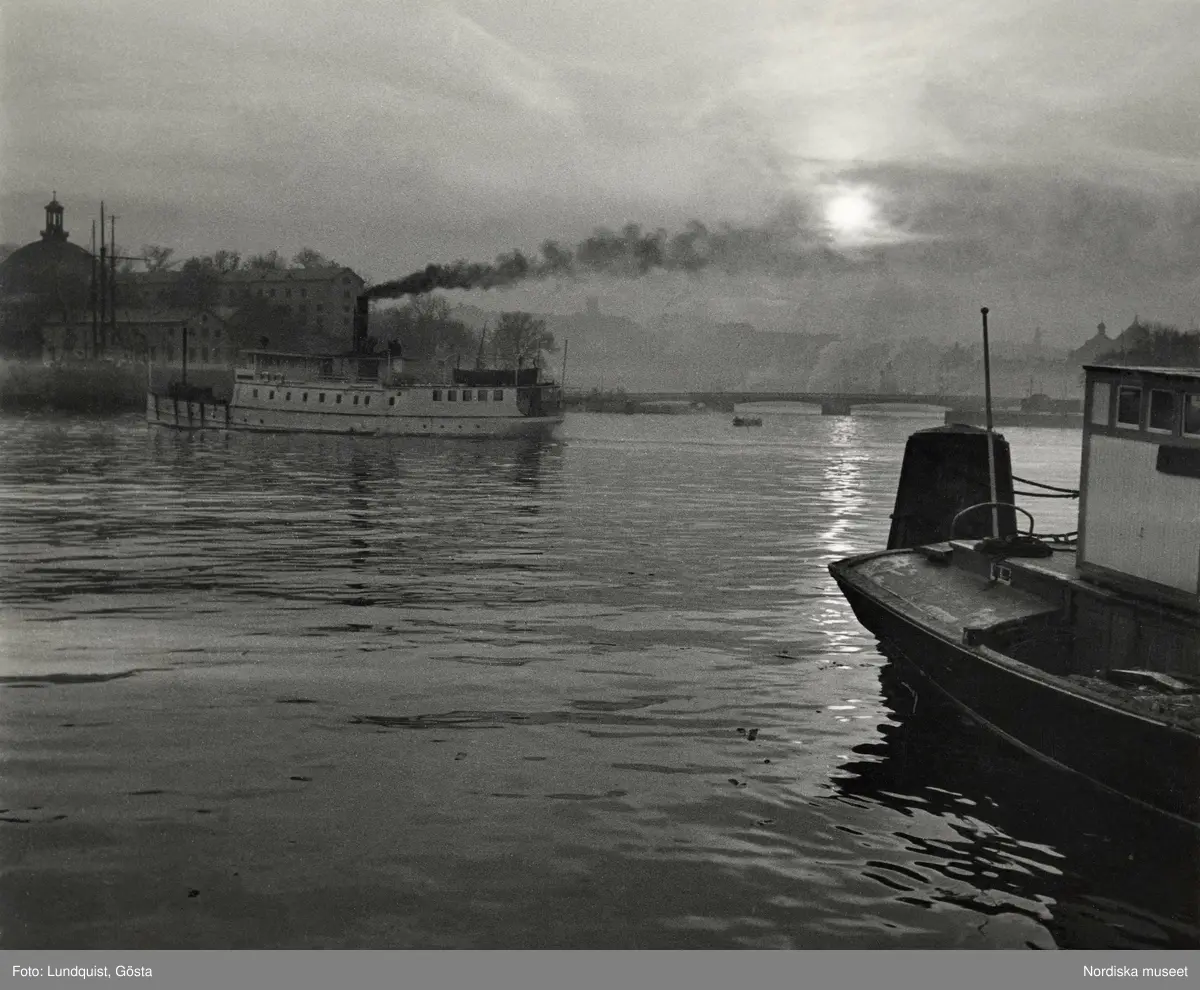 Båtar, varav en ångbåt, på Nybroviken i Stockholm en molnig dag. I bakgrunden Skeppsholmen.