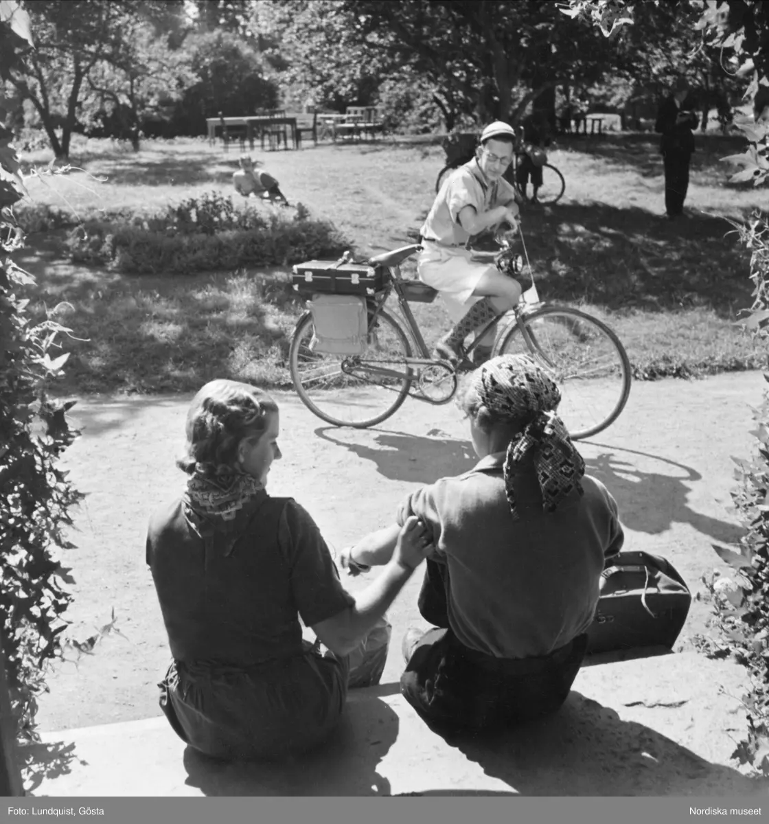Ungdomar vilar under cykelfärd. Två flckor sitter på en trappa, en ung man står med cykel på vägen framför dem.
