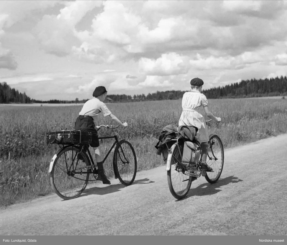 Två barn, pojke och flicka, på stora cyklar åker på grusväg intill en åker. Pojken har en resväska på pakethållaren.