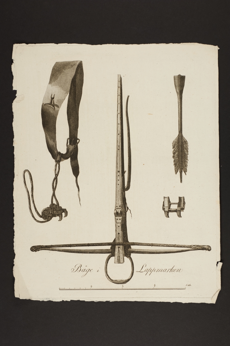 Gravyr, detaljerad studie av ett armborst. Påskrift: "Båge i Lappmarken". Ritad av C Gillberg, Carl Gustaf Gillberg (1774-1855) vid en resa år 1801. L.A. 1044. NM.0018900E.