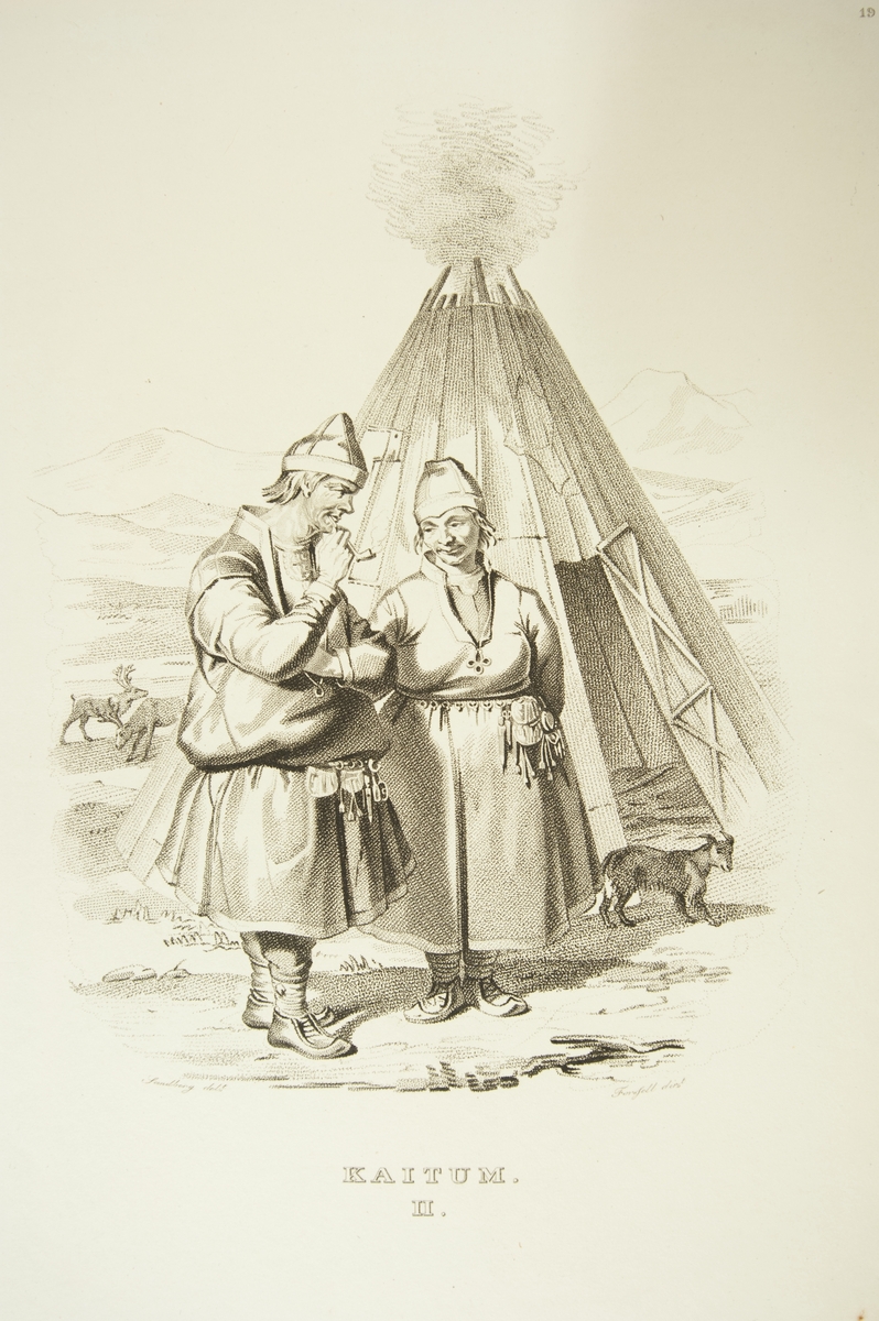 Tryck. "Kaitum. II." Man och kvinna framför kåta. L.A. 861