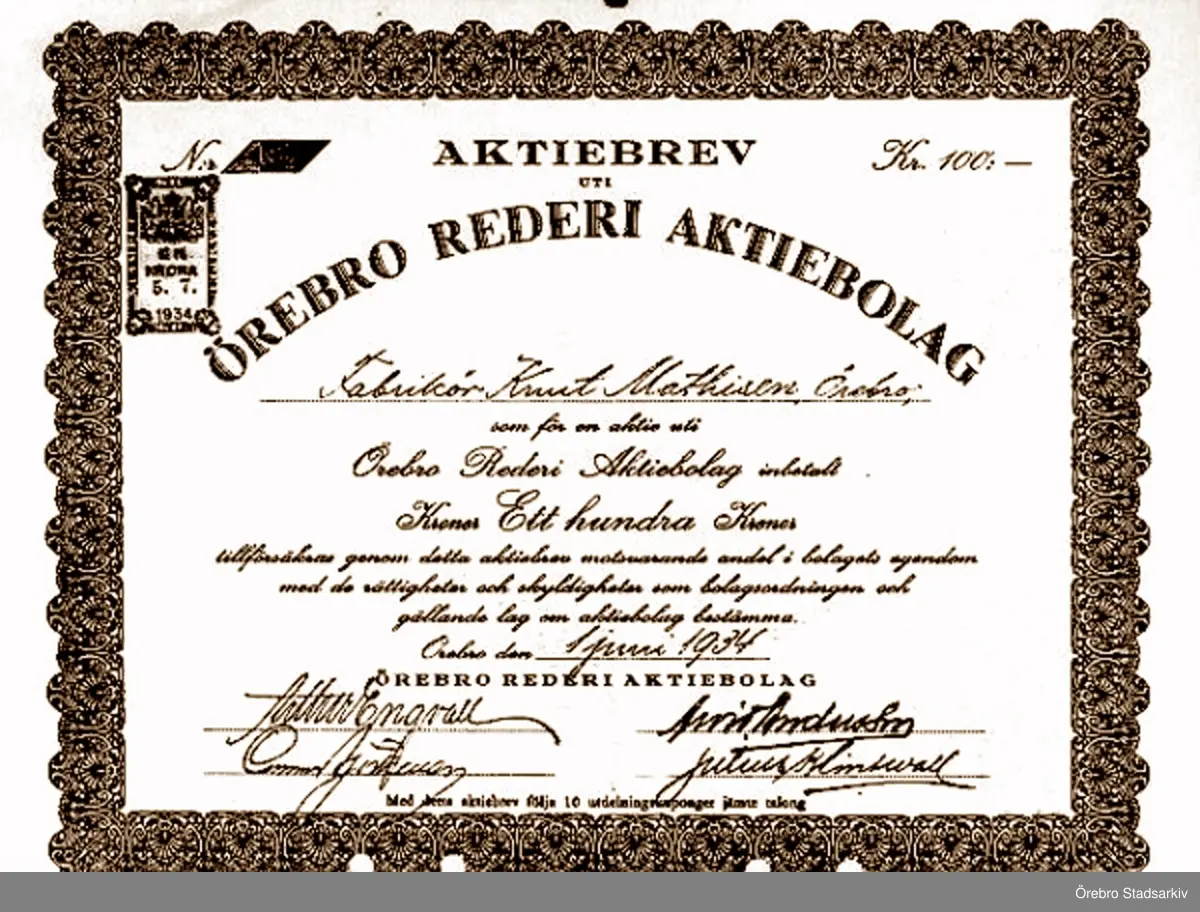 Aktiebrev i Örebro Rederi Aktiebolag, 1934
