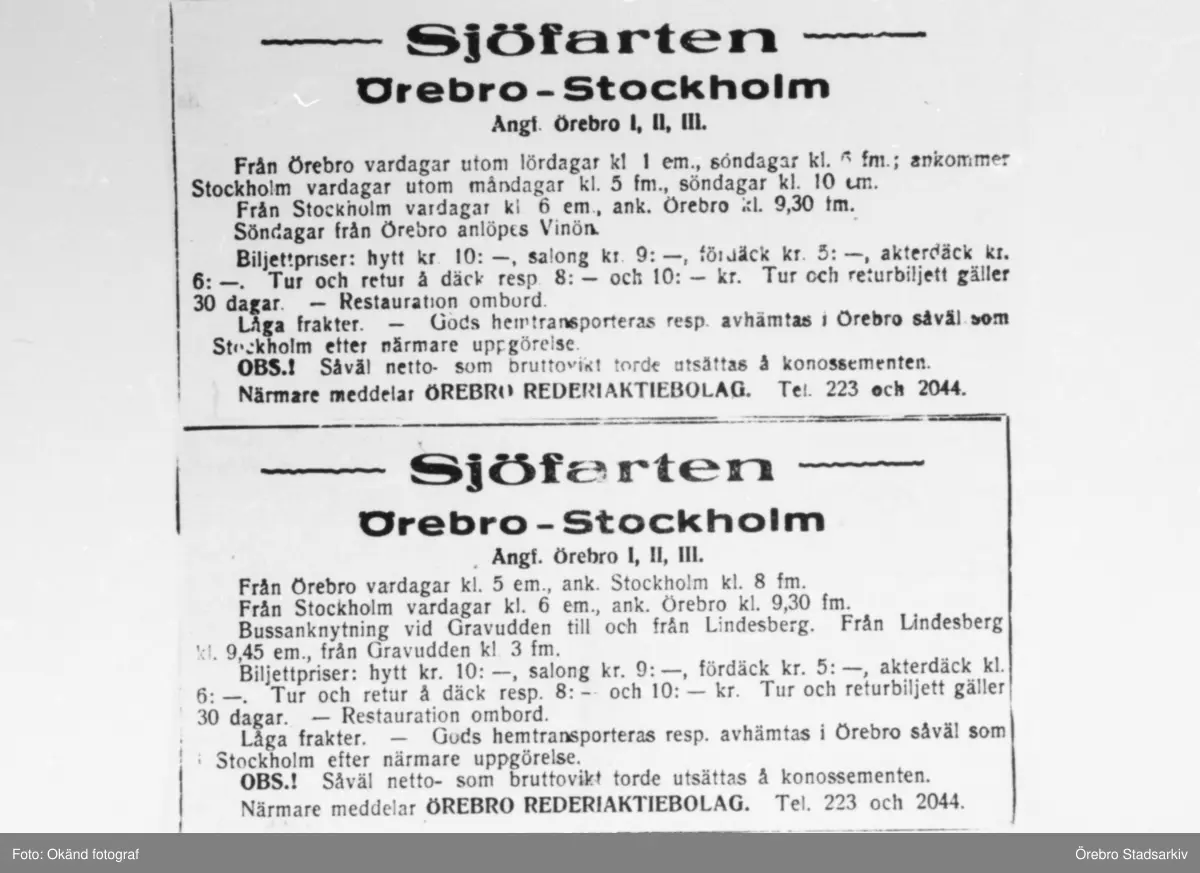 Turlista sjöfarten Örebro-Stockholm med Örebro I, II, III, 1920-tal