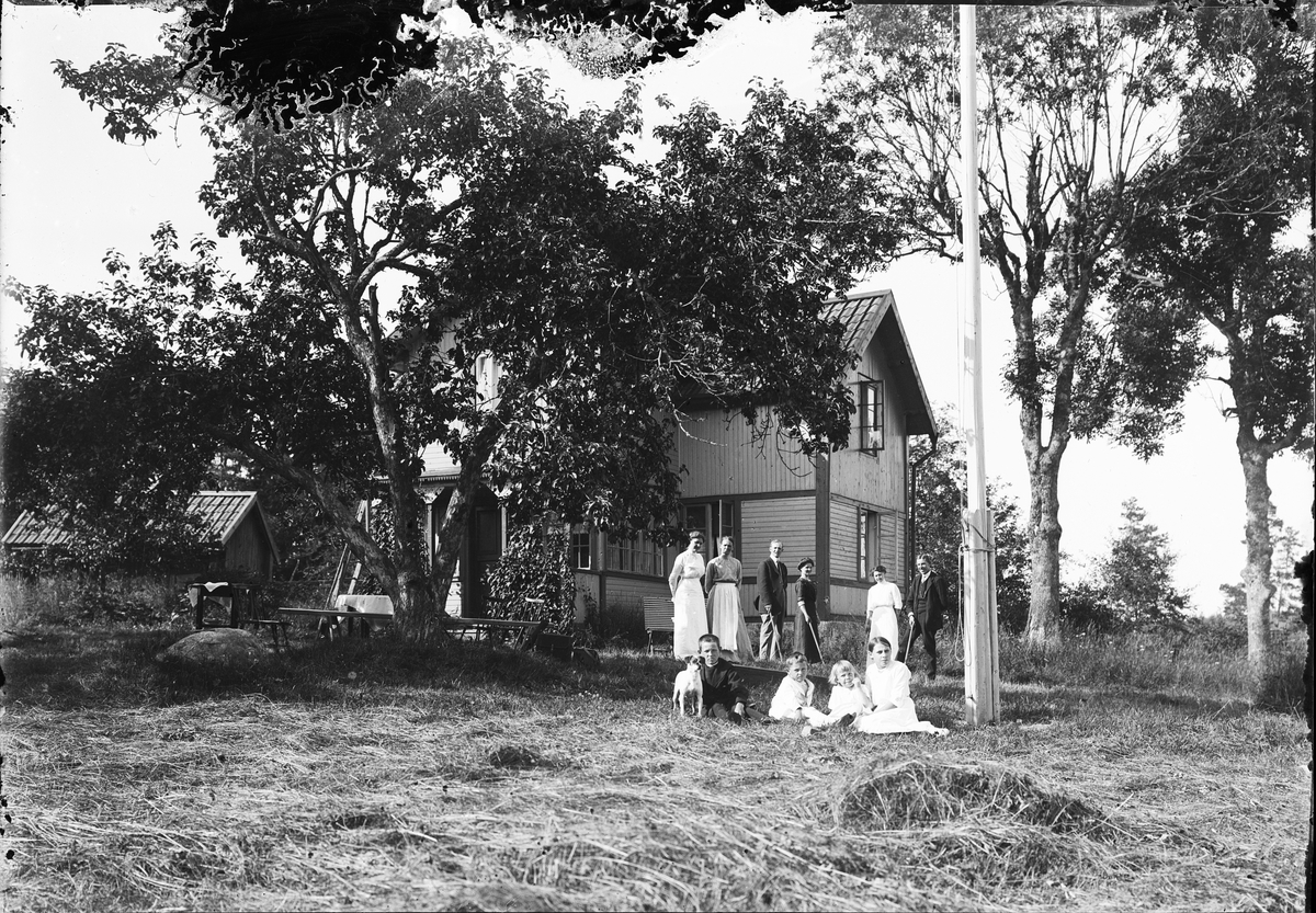 Familj i trädgården utanför bostadshus, Östhammar, Uppland