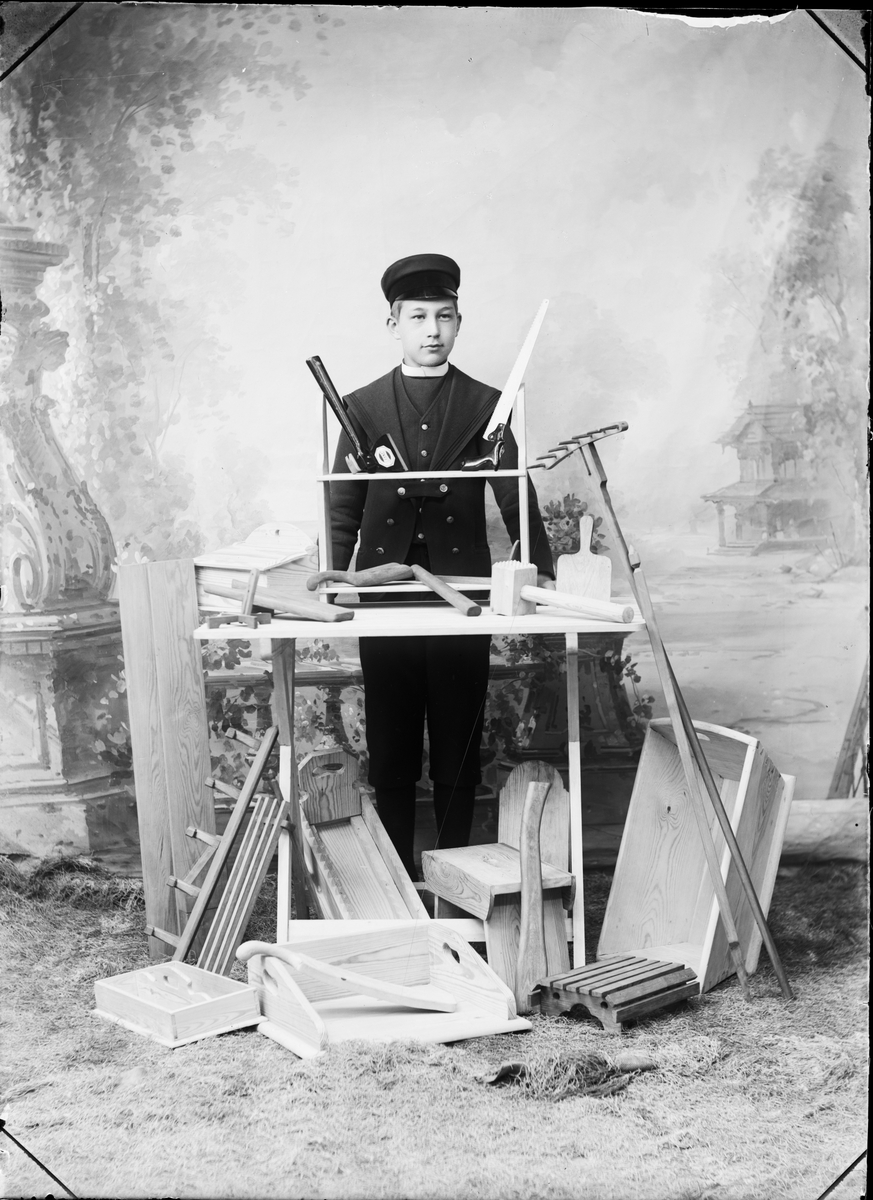 Josef Edhlund med verktyg och träföremål, Östhammar, Uppland