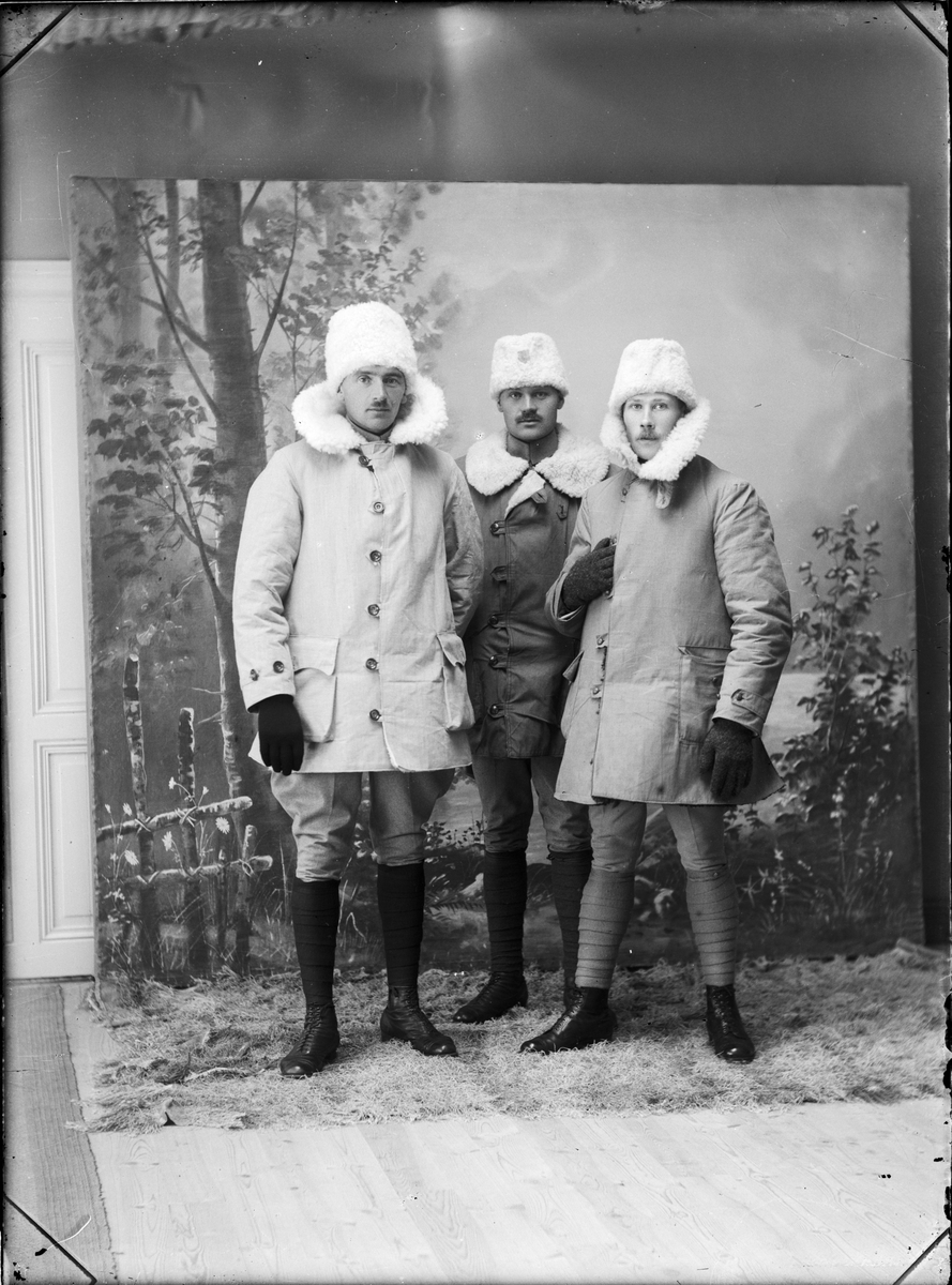 Ateljéporträtt - tre vinterklädda män, Östhammar, Uppland