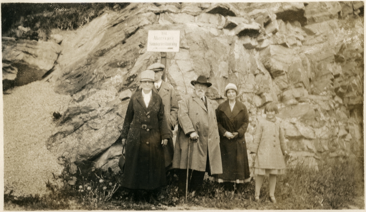 Trollhättan. Gruppbild framför skylt som visar vägen till Schweizeriet vid Åkersvass