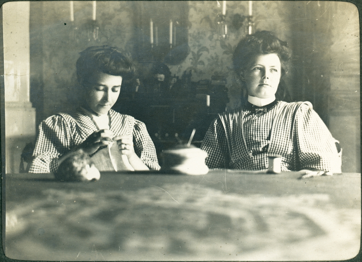 Fjärås prästgård. Martha Ljungnér och Nancy Gjers vid en täckstickningsbåge