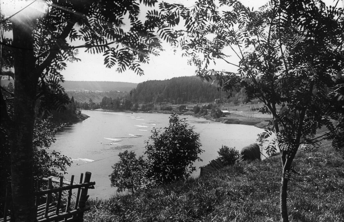 Utsikt från Bernhard Westins hem. Nedanför nipan flyter Ångermanälven förbi. Resele cirka 1925.