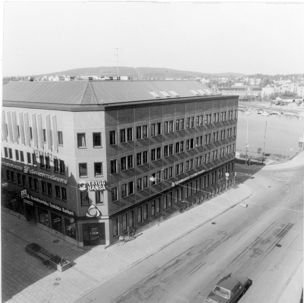 Korsningen Köpmangatan - Nybrogatan i Härnösand. Nattviken syns i bakgrunden.