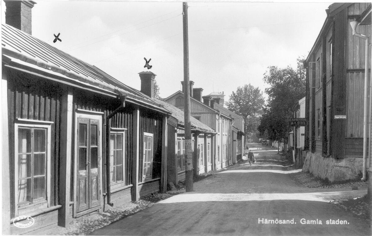 Titel: Bild mot N, till vänster Kv Lotsen, till höger Kv Fyren. Till höger kommer Skeppar Karls Gränd. Vykort.