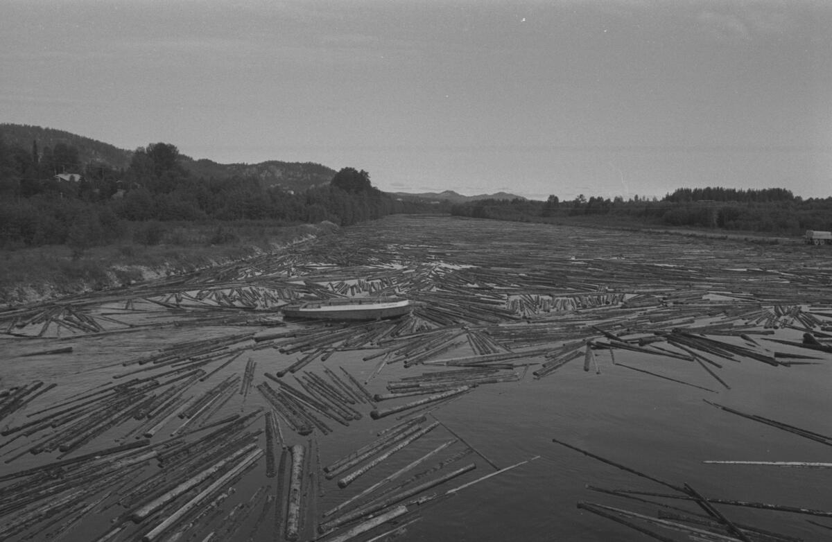 Ihoppackning av virket med radiostyrd båt i Ramseledammen. Gerhard Sevedsson styr båten.
