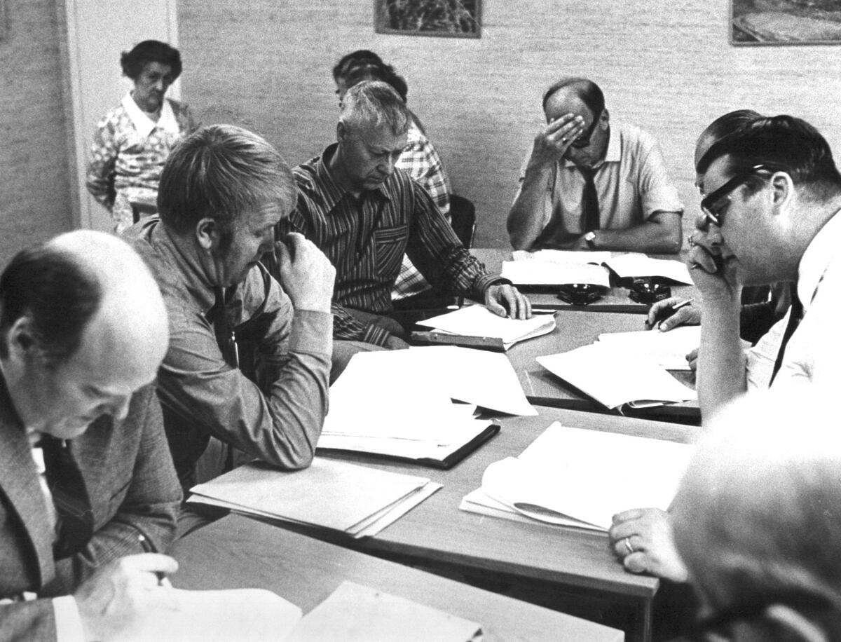 Socialdemokratiska gruppen i arbete före ett fullmäktigemöte. Fr.v Tage Carlsson, Väja, fullm.ordf Birger Nygren, Nyland, stående Anna Forsberg, Sandslån, Allan Nilsson, Kyrkdal, Sven Stenström, Väja och Harry Malmström, Bollstabruk.
