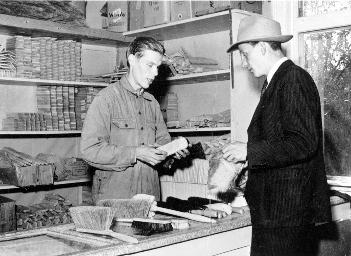 Borstbinderi. Seved Eriksson bakom disken. Han var uppväxt i Överskog. Blev synskadad som barn, och bedrev borstbinderiverksamhet både i Ramvik och Hälledal fram till sin död.