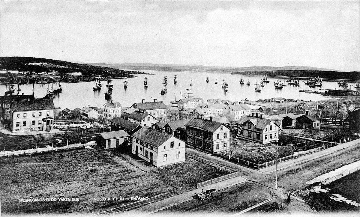 Vykort, cirka 1900. Fotot är sannolikt taget från tornet på Lärverket/Landgerensskolan. Gatan i förgrunden är Brunnshusgatan i korsningen med Skeppar Karls gränd
