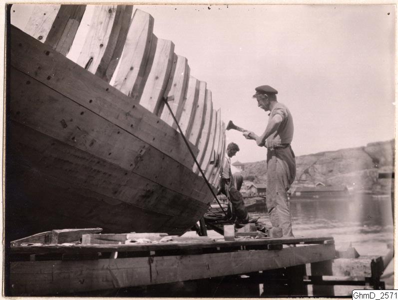 Svartvitt fotografi, del moment från byggnation av träbåt. "'Spanten huggas efter turkäppen." Man med redskap som arbetar på båten.