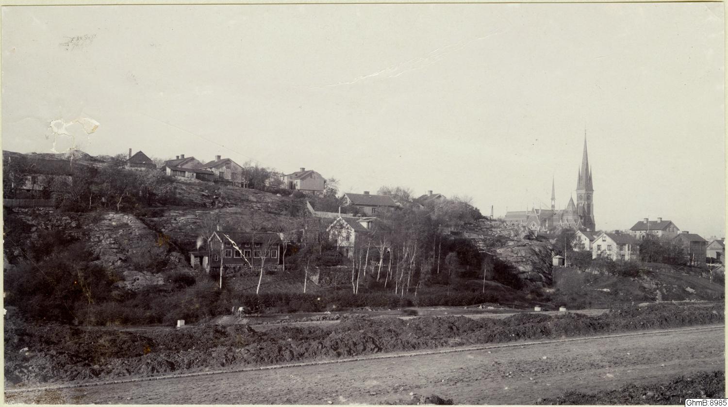 Vy över Kråkstaden med sina bostadshus, väster om blivande Linnégatan. På vägsträckningen i bildens nederkant pågår arbetet med Linnègatan. Tilll höger Oscar Fredriks kyrka.