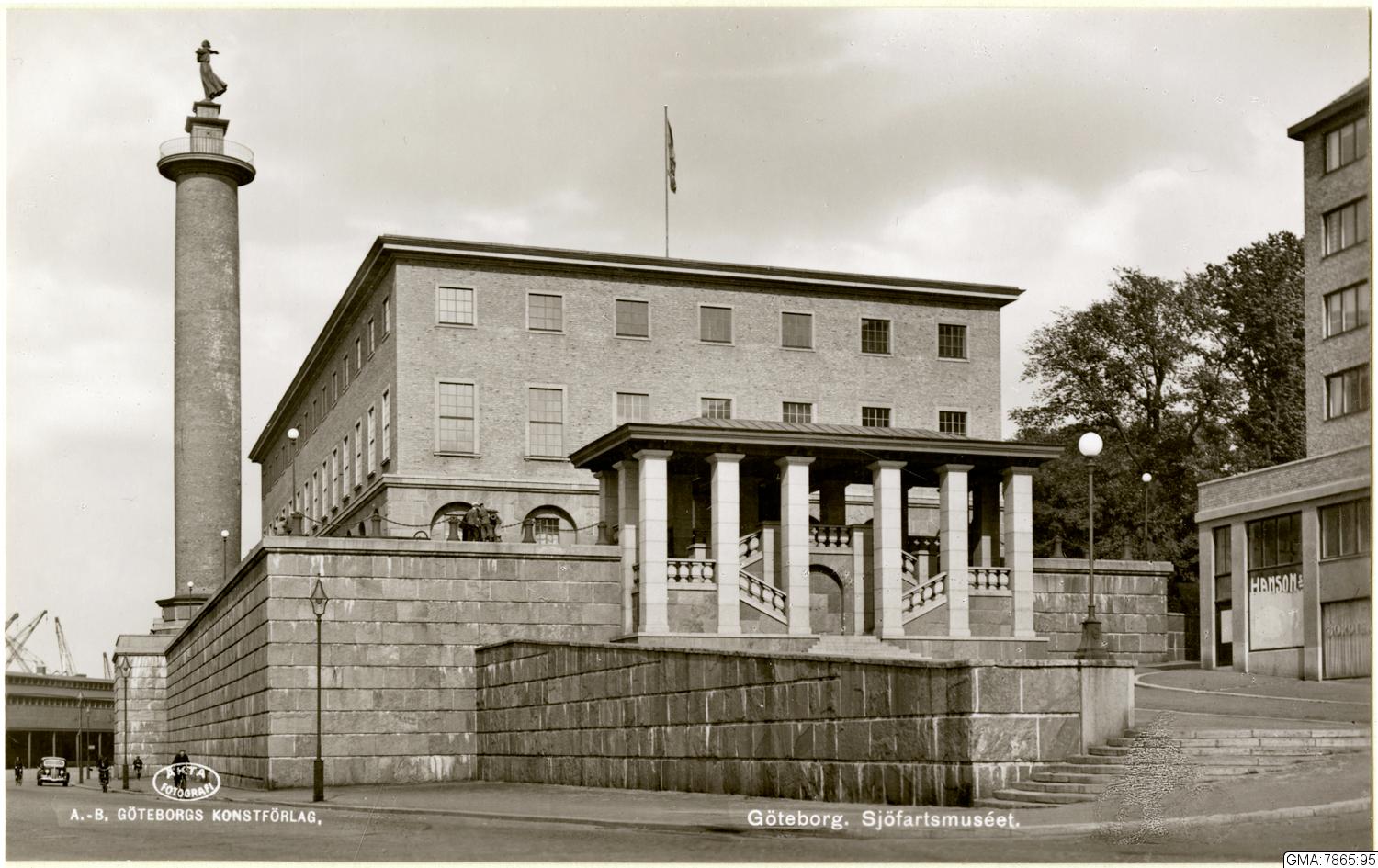 Entrén till Sjöfartsmuseet och Sjömanstornet med "Sjömanshustrun", Ivar Johnssons staty Kvinna vid havet. I bakgrunden till vänster syns Amerikaskjulet. Blick från Oscarsgatan mot öster.