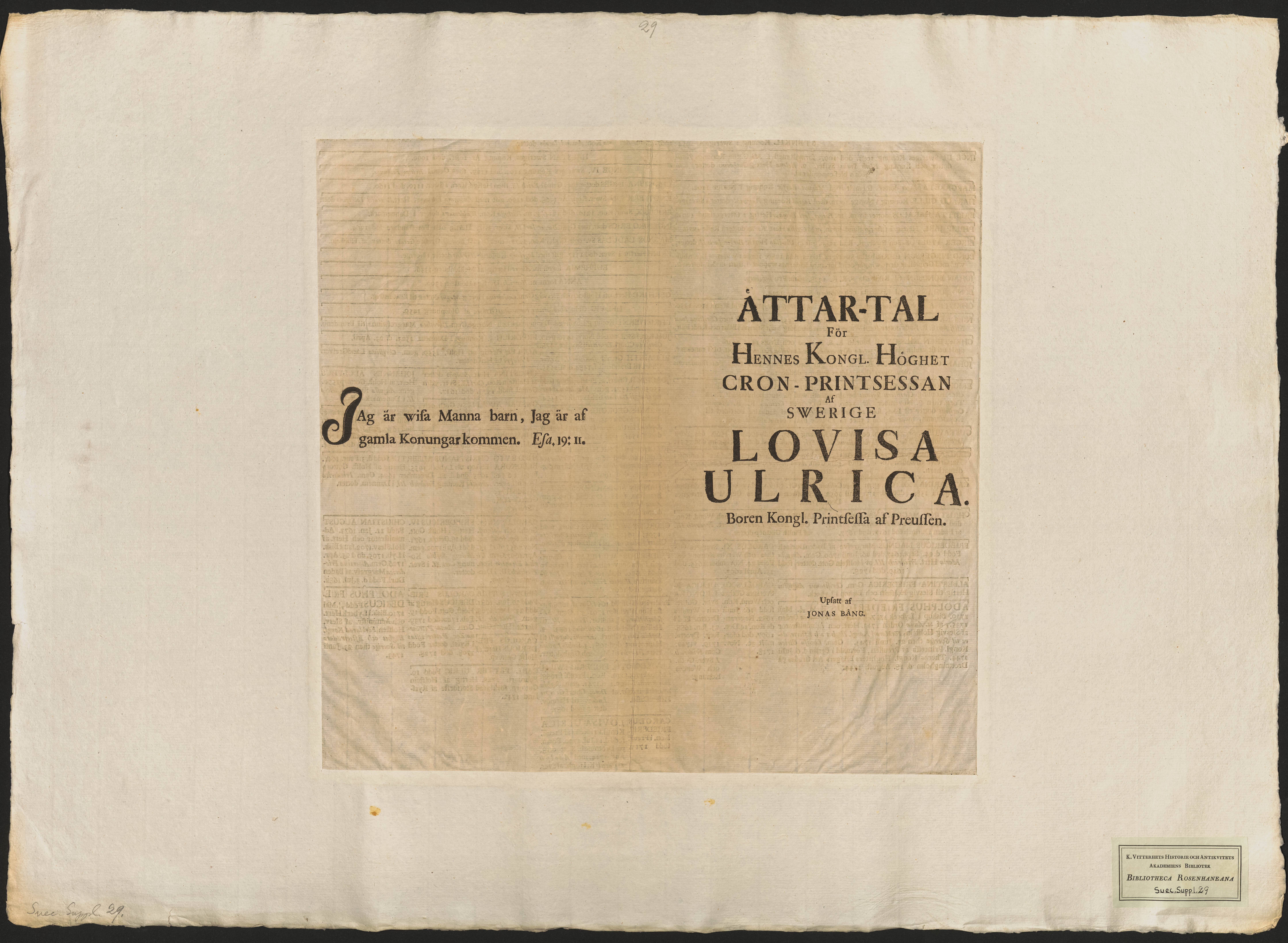 Beskrivning: 1 grafiskt bl. : Drottning Lovisa Ulricas släkttavla uppsatt af Jonas Bång