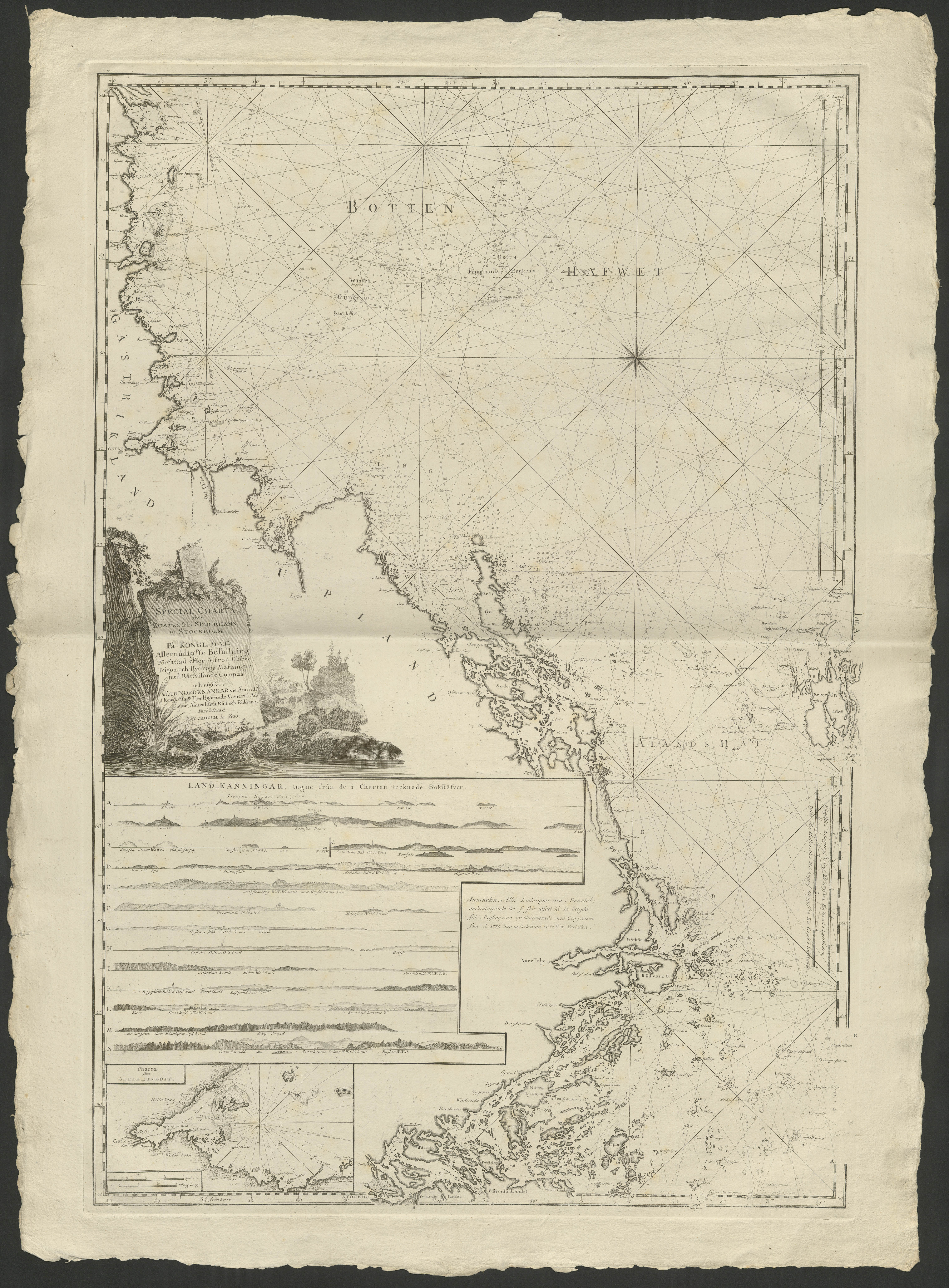 Beskrivning: 1 karta Förtoningar över kuststräckor. Special: Gävles inlopp och utgifven af Joh. Nordenankar, vice amiral, Kongl. Majts tjenstgörande general adjutant, amiralitets råd och riddare. Förbättrad Stockholm år 1800. ; i koppar stucken af Fr. Akrel.