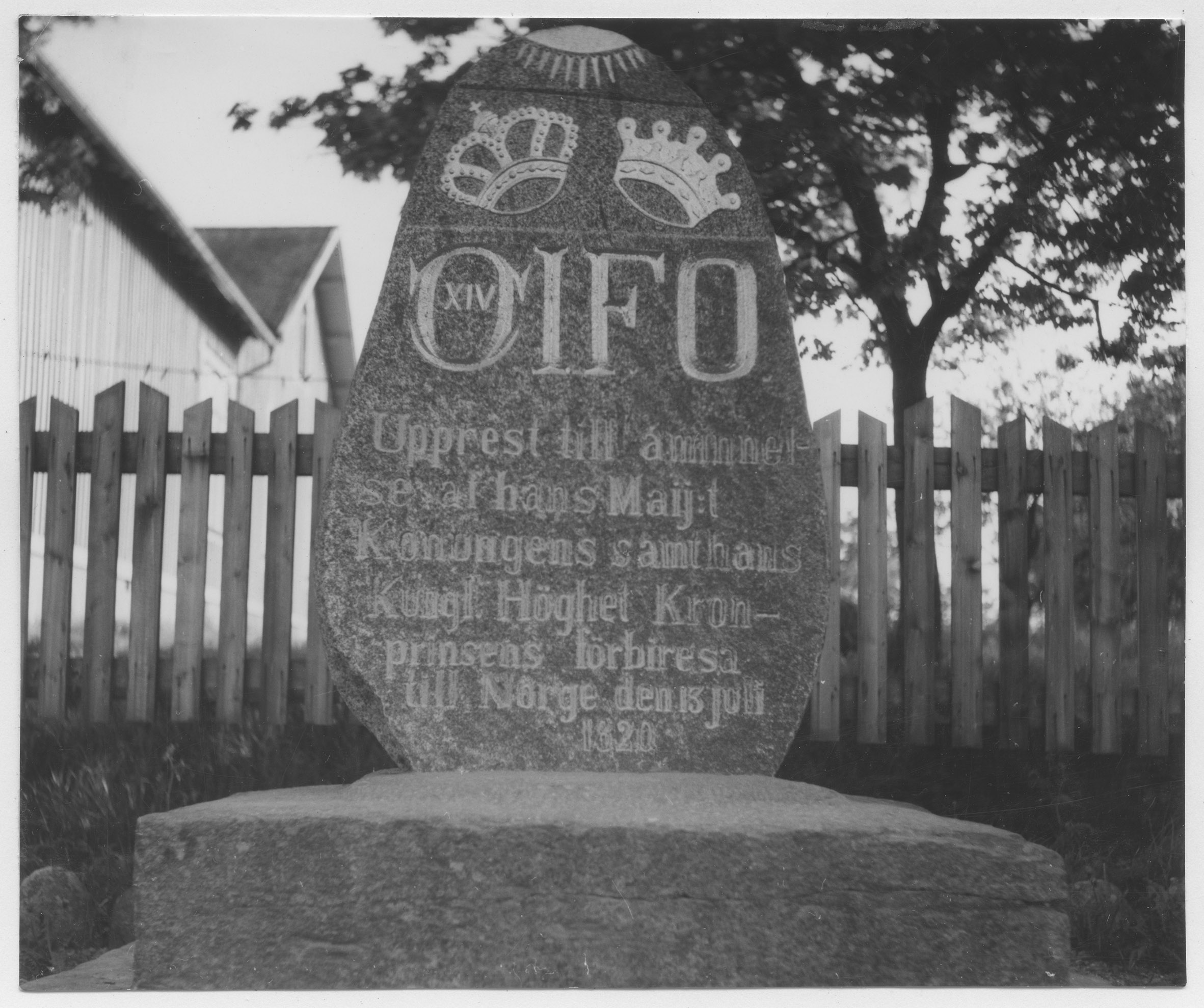 Beskrivning: Minnesstenen vid vägen nr 166, identisk med landsvägen till Norge. Vården bär konung Carl XIV Johans och kronprins Oscars initialer. Kungastenen.