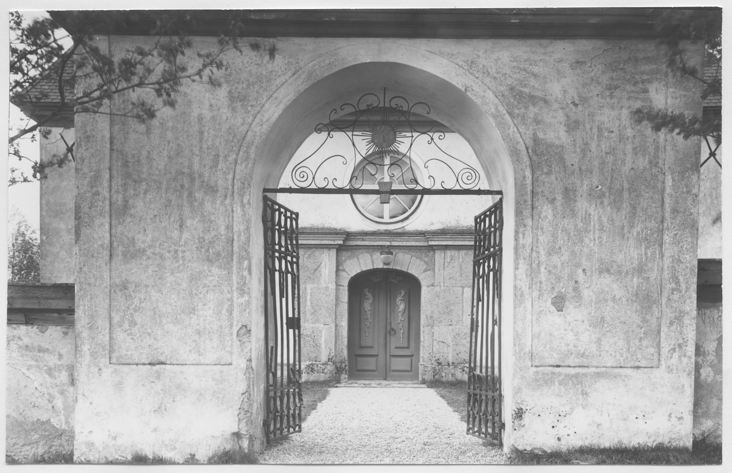Beskrivning: Kyrkogårdsport och kyrkoportal.