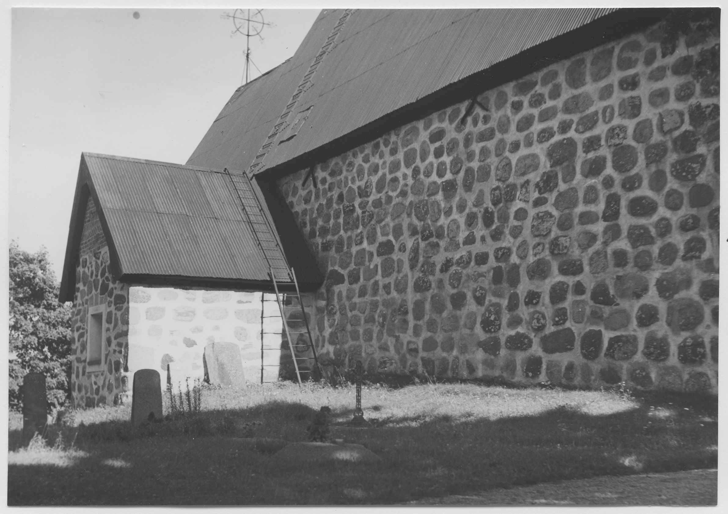 Beskrivning: Norra fasaden. På grund av folktrons motvilja mot norrläge saknar denna sida Fönster. (1200-tal).