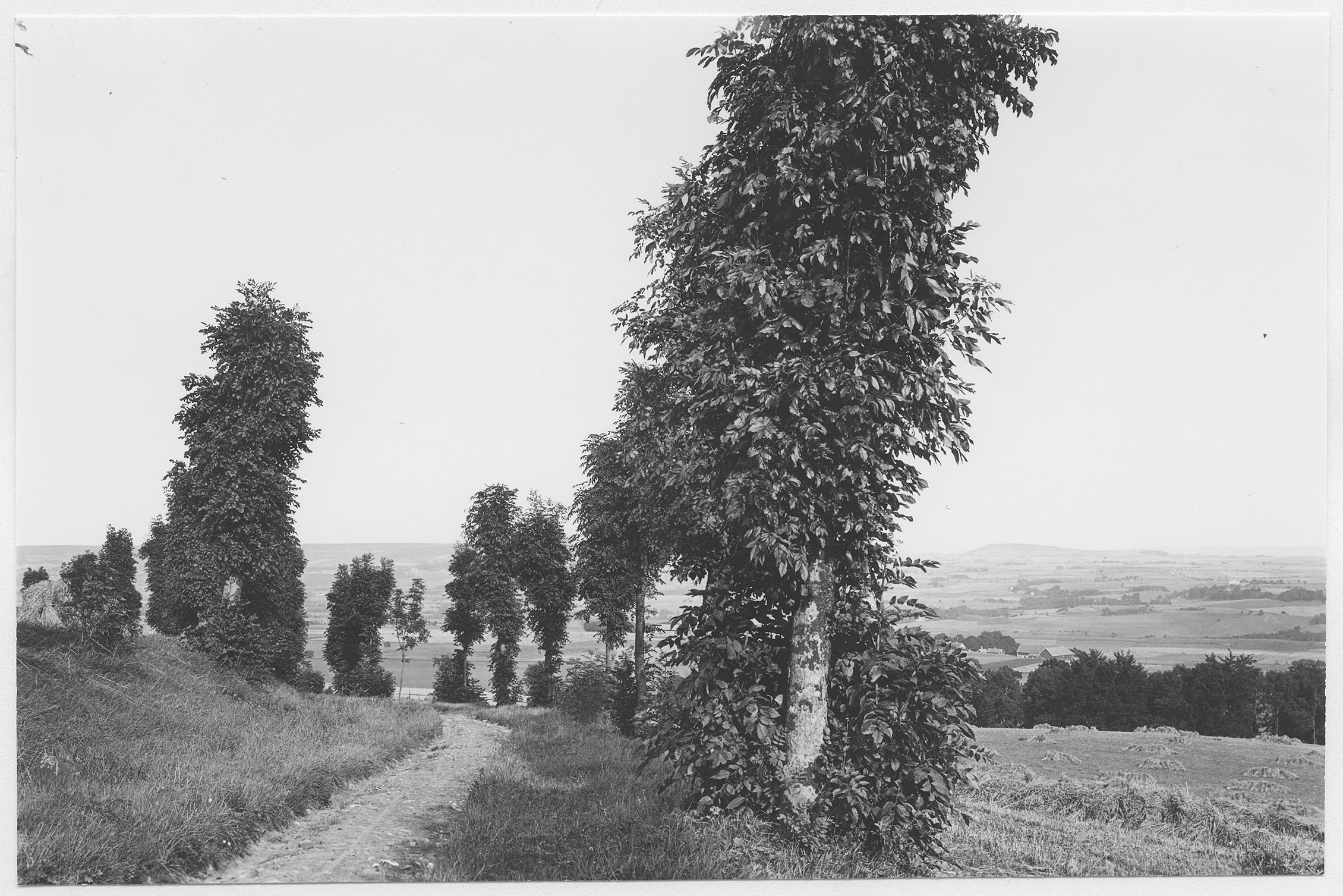 Beskrivning: Väg uppför Ållebergs östra sluttning med genom lövtäkt hamlade träd.