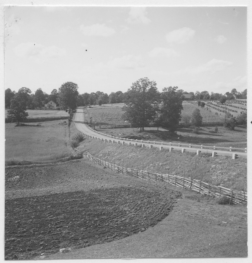 Beskrivning: Utsikt från kyrkbacken. Vägen mellan Stenberga och Nye.